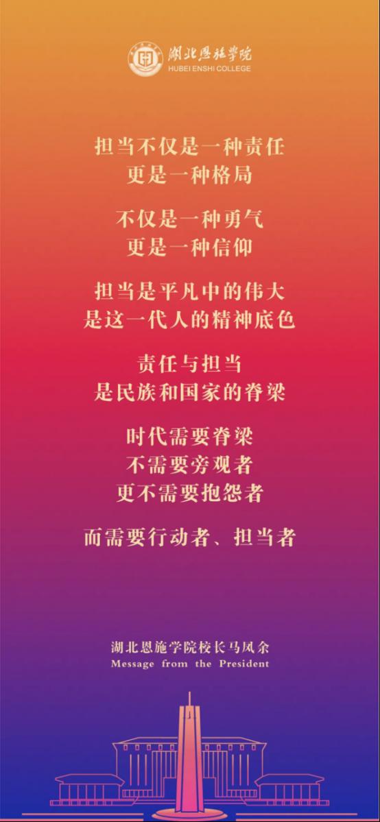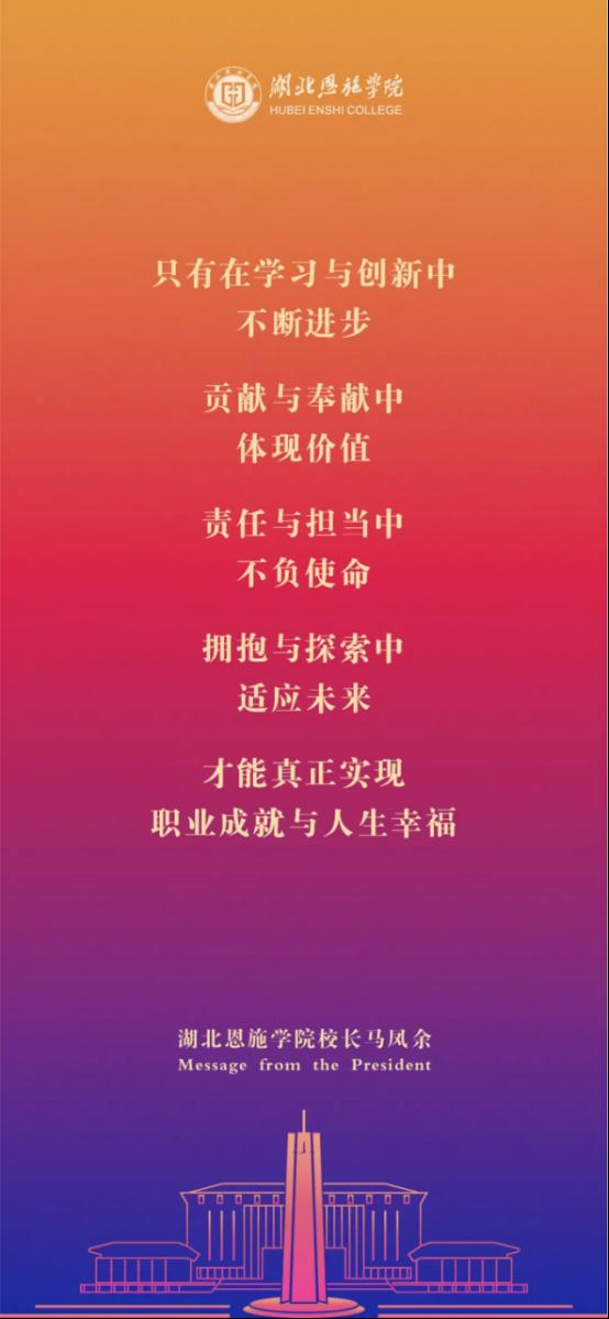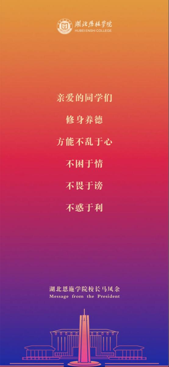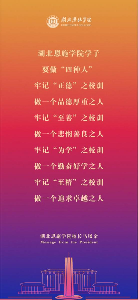 親愛的同學(xué)們,記得入學(xué)時,我與你們共勉恩施學(xué)院學(xué)子要做“四種人”,哪四種人:牢記“正德”之校訓(xùn),做一個品德厚重之人。牢記“至善”之校訓(xùn),做一個悲憫善良之人。牢記“為學(xué)”之校訓(xùn),做一個勤奮好學(xué)之人。牢記“至精”之校訓(xùn),做一個追求卓越之人。“德”是一個人的立功之本。德是海納百川的肚量,是高山仰止的氣度;“善”是一個人最好的修養(yǎng),是世界上最美的成全;“學(xué)”是一個人最好的發(fā)展,是人生最大的競爭資本;“精”是一個人最好的優(yōu)越,是人生最大的價值!八百里清江之波瀾、之不息、之奔騰,琴湖之瀲滟,之清澈、之寧靜。猶如恩施院學(xué)子之勤勞、之純樸、之善良,之自強、之拼搏、之卓越?!扒趧?、純樸、善良,自強、拼搏、卓越”這是恩施學(xué)院學(xué)子應(yīng)有的本色與品質(zhì)!