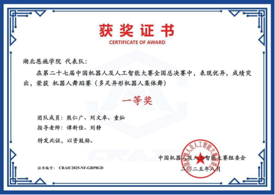 中國機器人及人工智能大賽始于1999年,是我國規(guī)模最大、影響力最強、專業(yè)水平最高的機器人競賽之一。在2025年全國總決賽的巔峰對決中,我?!抖嘧惝愋螜C器人集體舞》項目憑借獨特的創(chuàng)意與精湛的技術脫穎而出,勇奪國家一等獎,在人工智能賽道上為學校贏得至高榮譽。