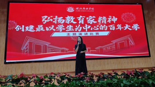 預(yù)賽評委恩施州電視臺崔津津老師指出:弘揚教育家精神是加快建設(shè)教育強國的重要內(nèi)容、也是建設(shè)特色大學(xué)的重要體現(xiàn),是高校文化建設(shè)的重要精神內(nèi)涵。她表揚了參賽選手情感真摯、感情豐富、飽含熱情,演講主題鮮明,語言生動優(yōu)美;并呼吁參賽選手要繼續(xù)弘揚教育家精神,牢記立德樹人的根本任務(wù),切實擔(dān)當(dāng)起“為黨育人,為國育才”的重要使命。