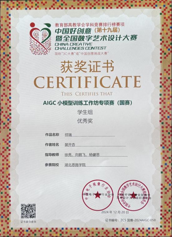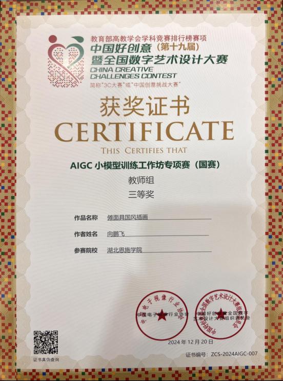 12月20日上午,中國(guó)好創(chuàng)意(第十九屆)暨全國(guó)數(shù)字藝術(shù)設(shè)計(jì)大賽·AIGC小模型訓(xùn)練工作坊專項(xiàng)賽(國(guó)賽)在西安郵電大學(xué)圓滿落幕。經(jīng)過專家現(xiàn)場(chǎng)評(píng)分并頒獎(jiǎng),湖北恩施學(xué)院參賽團(tuán)隊(duì)?wèi){借卓越的創(chuàng)新能力與扎實(shí)的技術(shù)水平,取得了令人矚目的成績(jī)。