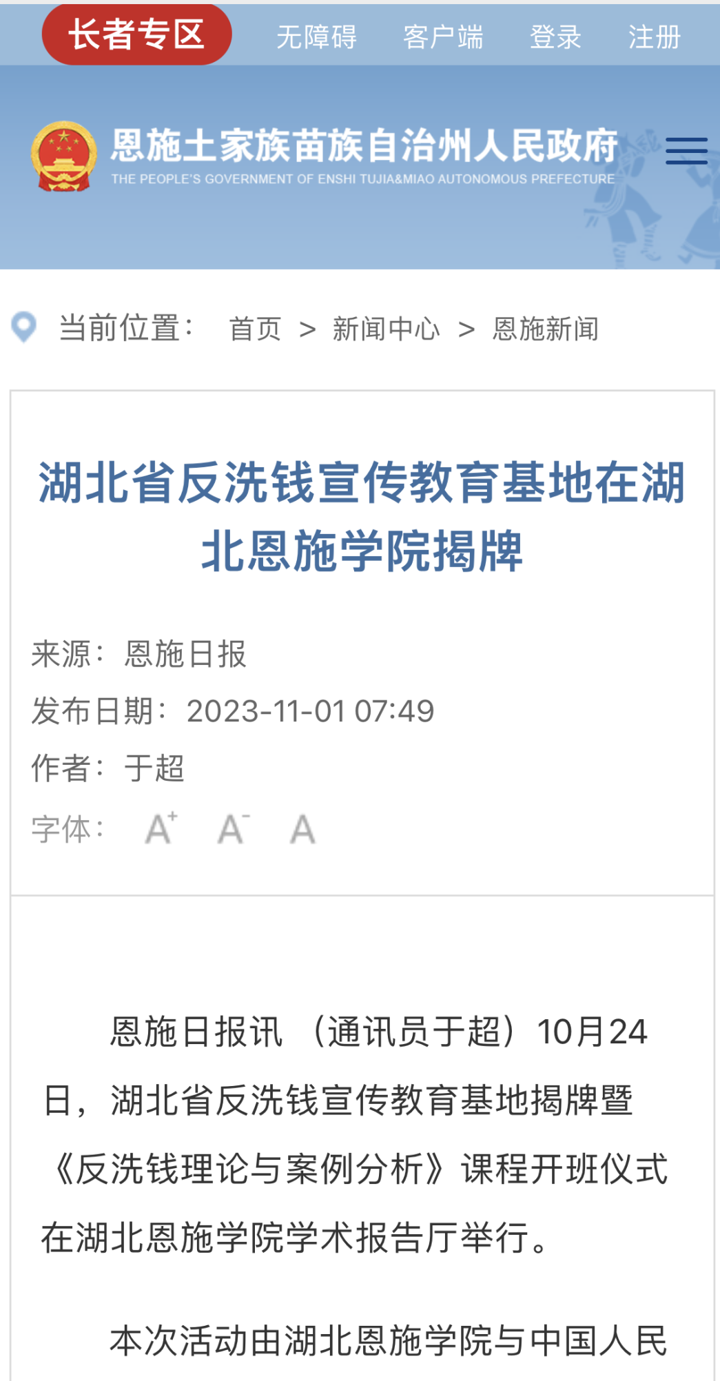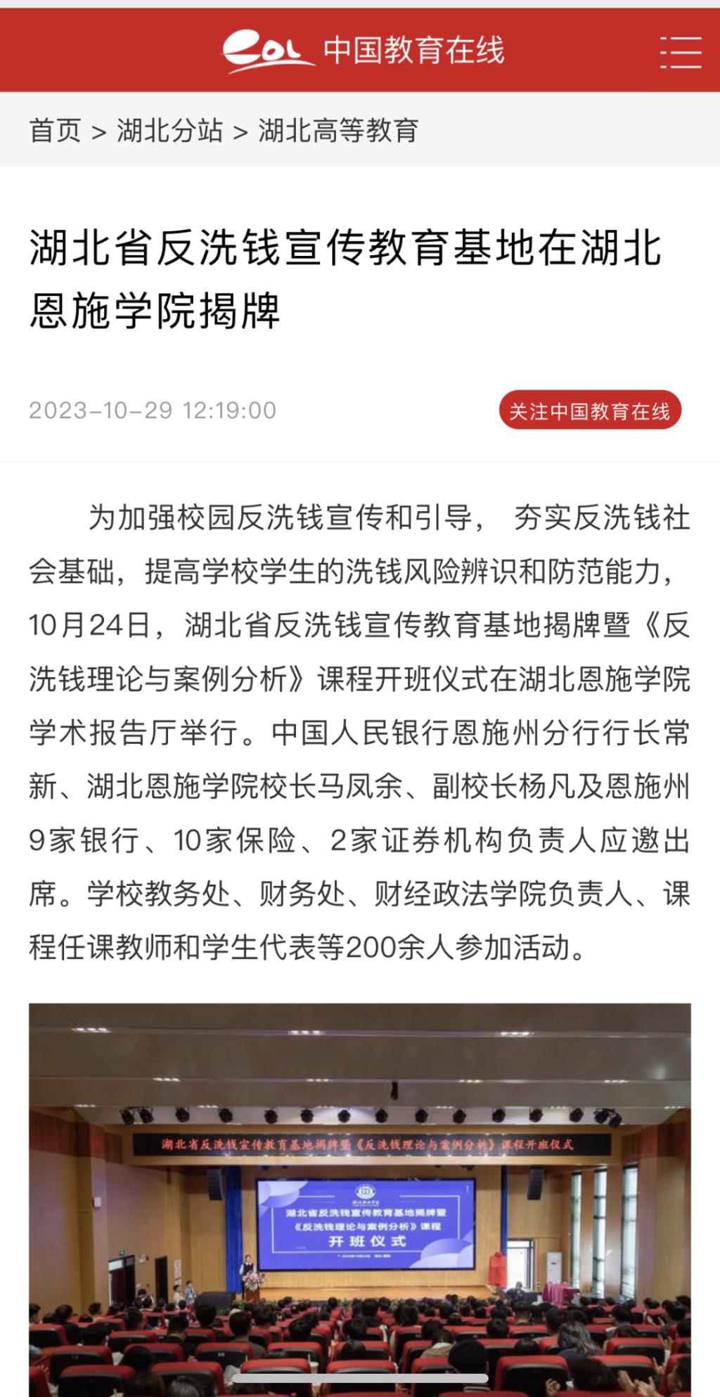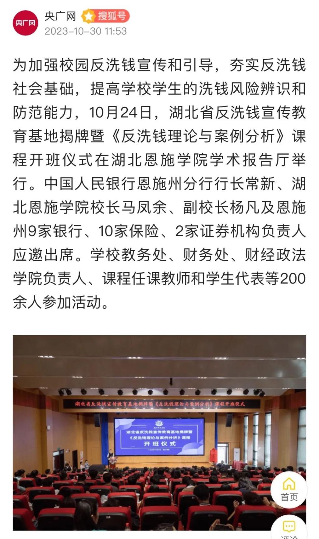 近日,湖北恩施學(xué)院《反洗錢理論與案例分析》這門課程亮相湖北教育頻道。這既是湖北省首次將反洗錢知識(shí)融入通識(shí)課程的創(chuàng)新舉措,也是學(xué)校進(jìn)行通識(shí)課程改革的大膽嘗試。新聞一經(jīng)播出,恩施學(xué)院這門課程獲得各大權(quán)威媒體的廣泛關(guān)注!