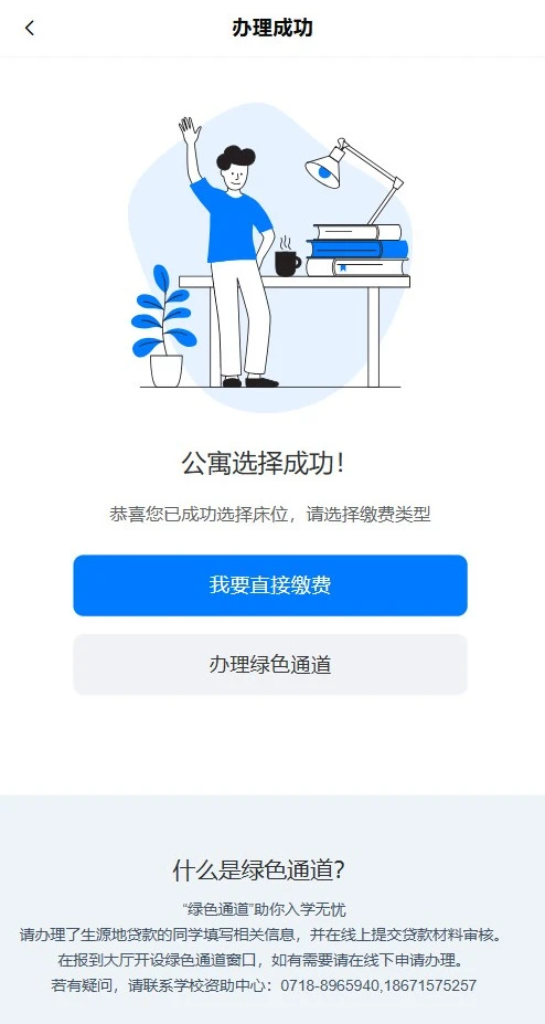 根據(jù)個人情況進行繳費類型選擇;如果無生源地貸款點擊“我要直接繳費”;若有生源地貸款點擊“辦理綠色通道”