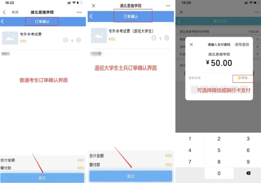 通過資格審核的考生于3月31日8:00—4月4日18:00,在微信搜索數(shù)字恩施學(xué)院公眾號或支付寶搜索湖北恩施學(xué)院小程序及時網(wǎng)絡(luò)繳費(具體步驟詳見附件)。按《湖北省物價局、湖北省財政廳關(guān)于規(guī)范教育招生考試收費有關(guān)問題的通知》(鄂價費[2006]107號)批準(zhǔn)的標(biāo)準(zhǔn)執(zhí)行),普通考生需交納報名考試費80元/人,退役大學(xué)生士兵需交納報名考試費50元/人,其中申請免試的退役大學(xué)生士兵考生免費。未繳費的考生,視為自動放棄報名。