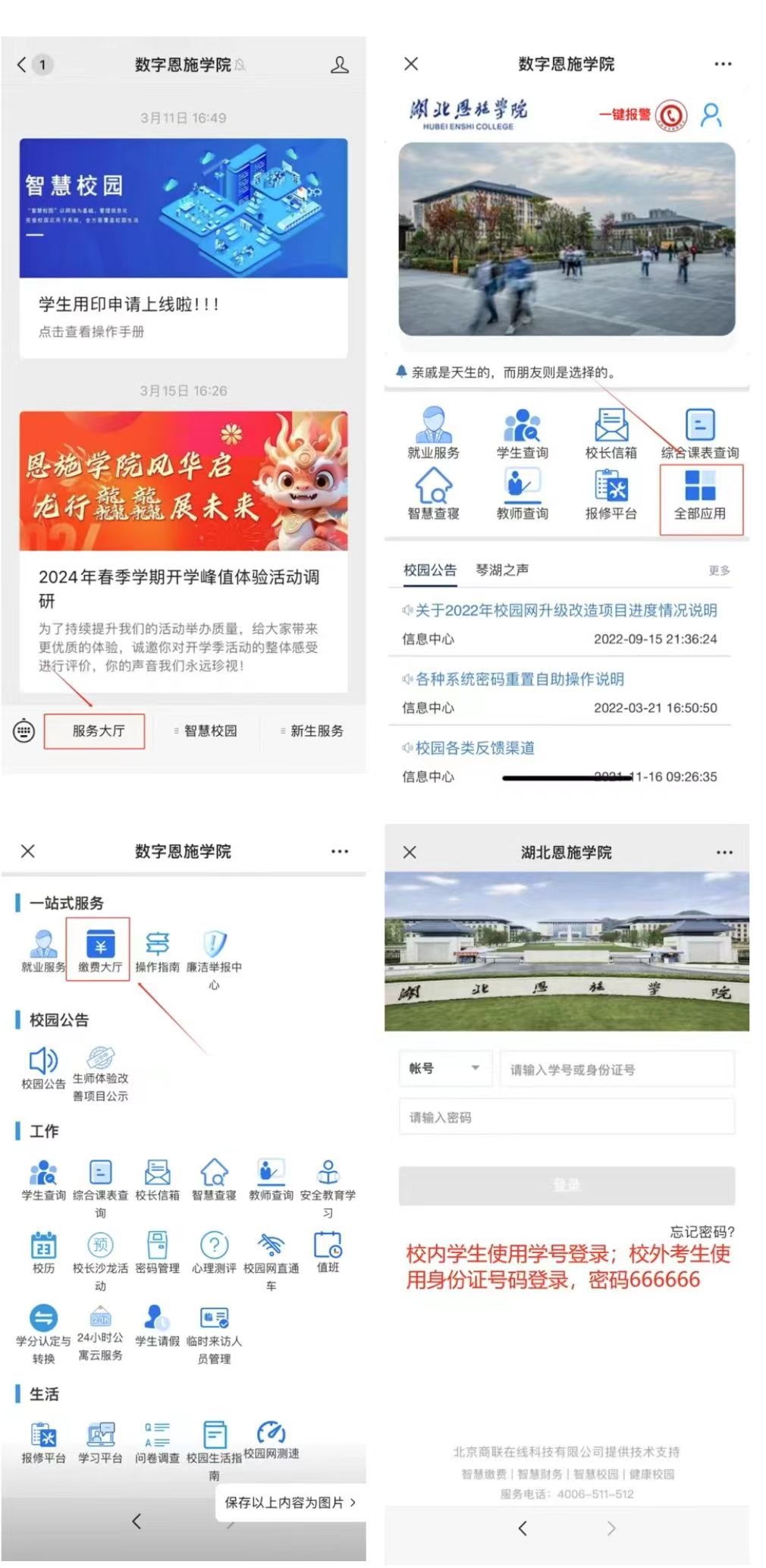 第二步:進(jìn)入數(shù)字恩施學(xué)院公眾號,點擊菜單:服務(wù)大廳/智慧校園-繳費大廳,進(jìn)入登錄頁面;校內(nèi)學(xué)生請輸入學(xué)號和密碼進(jìn)行登錄,校外學(xué)生請輸入身份證號碼和密碼(666666)進(jìn)行登錄。