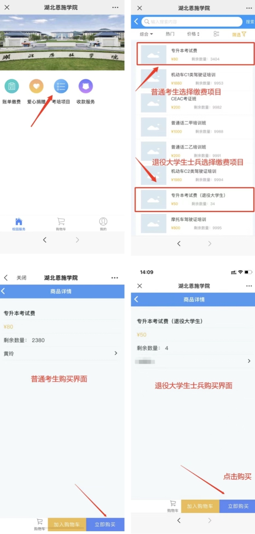 第三步:進(jìn)入繳費大廳后點擊考培項目,普通考生選擇:專升本考試費,價格:¥80.00,點擊立即購買;退役大學(xué)生士兵考生選擇:專升本考試費(退役大學(xué)生),價格:¥50.00,點擊立即購買。
