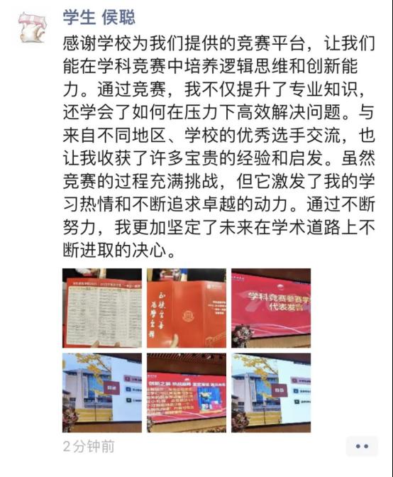 隨后,學(xué)科競賽指導(dǎo)老師代表劉俊娥老師發(fā)言,分享在指導(dǎo)過程中的寶貴經(jīng)驗和深刻見解。學(xué)科競賽獲獎學(xué)生代表王茜分享參賽感悟,道出了競賽的艱辛與快樂,并鼓勵學(xué)弟學(xué)妹們積極參加各類學(xué)科競賽。