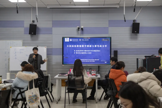 在教師教學(xué)創(chuàng)新大賽工作坊上,陳世光和李園園針對(duì)教創(chuàng)賽需要提交的相關(guān)材料對(duì)我校的教創(chuàng)賽種子團(tuán)展開了針對(duì)性培訓(xùn)。陳世光從創(chuàng)新成果報(bào)告和現(xiàn)場匯報(bào)的核心要點(diǎn)展開分析,列出了目錄中必須包含的幾大要素,即課程目標(biāo)、學(xué)情分析、教學(xué)痛點(diǎn)、已達(dá)成課程目標(biāo)、創(chuàng)新舉措、尚需改進(jìn)以及課程成效,建議各位老師讓學(xué)生參與到課程中,讓成果顯化。此外,陳世光還實(shí)時(shí)演示了現(xiàn)場匯報(bào)的每一個(gè)環(huán)節(jié)的語氣及匯報(bào)重點(diǎn),讓老師們受益匪淺。