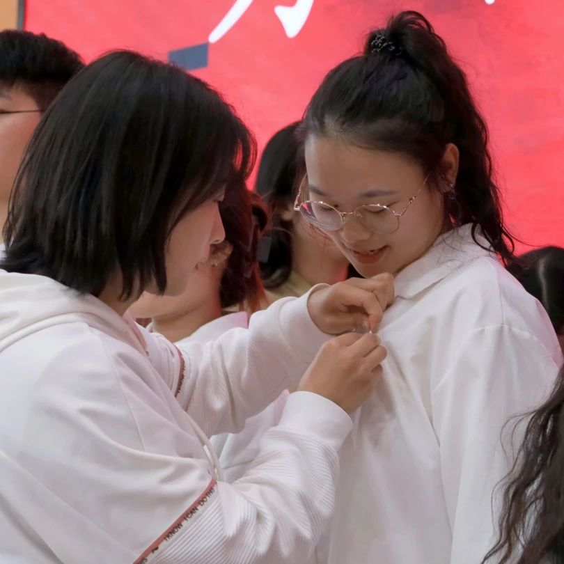 老師為新團(tuán)員代表佩戴團(tuán)徽