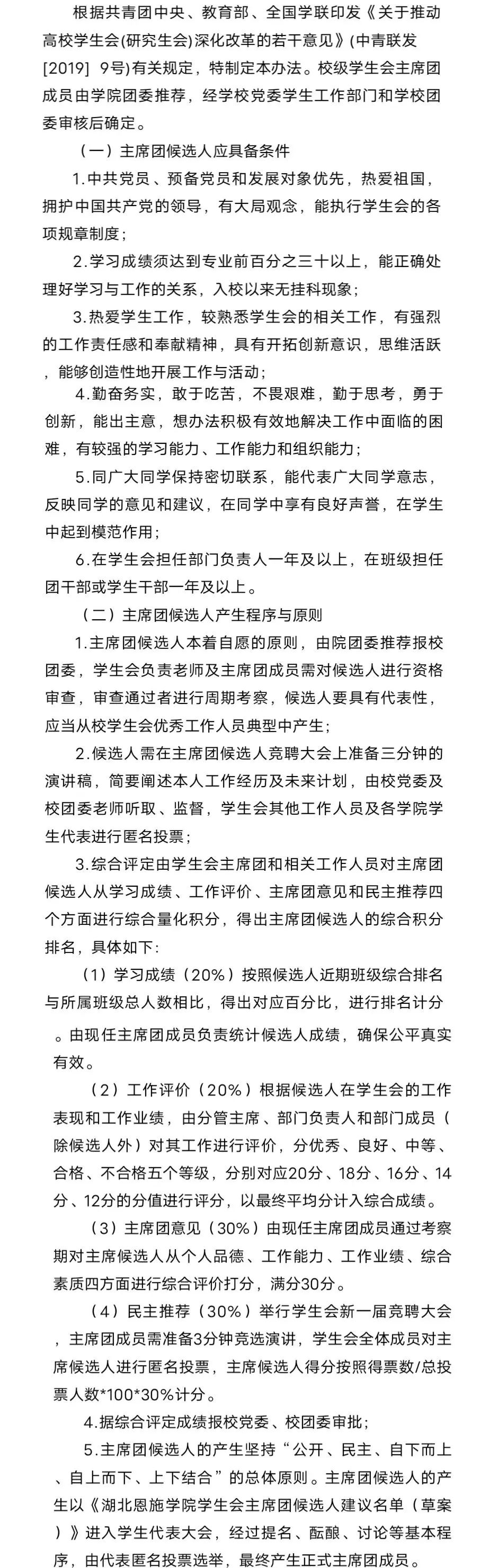 第十五條湖北恩施學院學生會主席團(以下簡稱“校學生會主席團”)是湖北恩施學院學生會組織的日常工作機構(gòu),組織架構(gòu)為“主席團+工作部門”模式。學生會主席團集體負責學生會重大事項,不設主席、副主席,設執(zhí)行主席,執(zhí)行主席由主席團成員輪值擔任,以學期為一個輪值周期,執(zhí)行主席負責召集會議、牽頭日常工作。