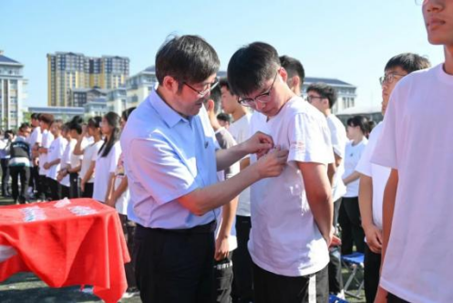 典禮上,校領(lǐng)導(dǎo)和老師們?yōu)樾律砼宕餍;?,這枚校徽體現(xiàn)的不只是一種身份,更是老師對學(xué)生寄予的殷切希望。它承載的是一份光榮的使命,是恩施學(xué)院學(xué)子的夢想、榮耀與責(zé)任,它將鞭策每一位新生開拓進(jìn)取、奮勇向前!