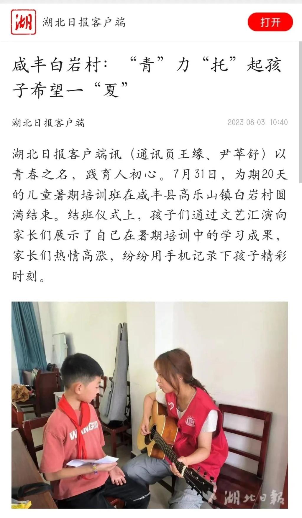 風(fēng)好正是揚(yáng)帆時,奮楫逐浪向未來。盡管赤日炎炎,“青春之我”志愿服務(wù)隊(duì)始終發(fā)揚(yáng)“不甘人后、敢為人先”的進(jìn)取精神,在咸豐縣高樂山鎮(zhèn)白巖村堅(jiān)守。他們的表現(xiàn)引起了社會上的廣泛關(guān)注:該團(tuán)隊(duì)暑期“三下鄉(xiāng)”社會實(shí)踐活動被湖北日報、咸豐新聞網(wǎng)等主流媒體相繼報道。青年志愿者們用汗水詮釋擔(dān)當(dāng)、攜信仰砥礪前行,以實(shí)際行動串聯(lián)起與時偕行的青春旋律!