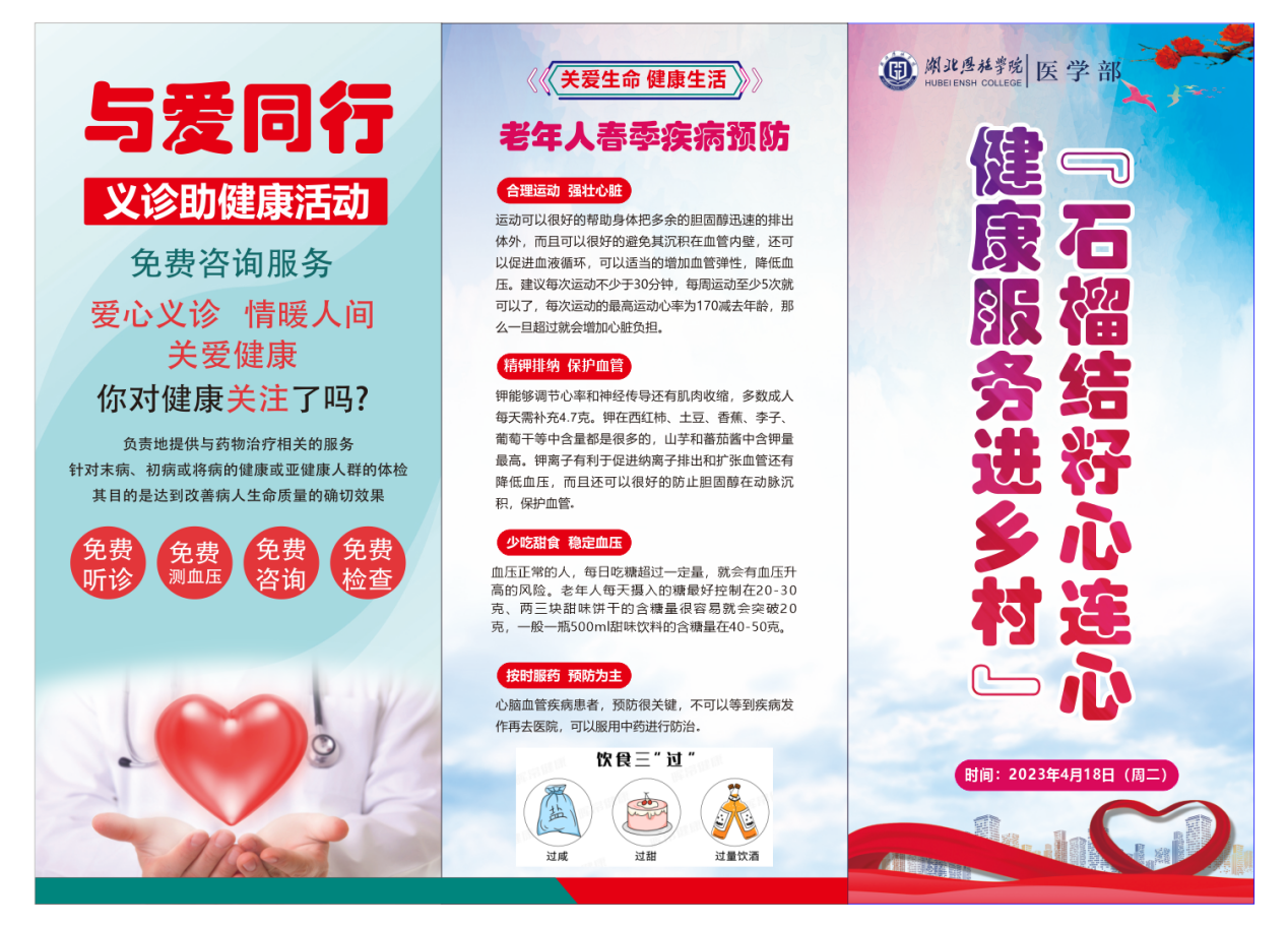 “與愛同行”義診健康活動和醫(yī)學(xué)生實踐活動同步在村委會開展。來自慧宜醫(yī)院的16位專家團隊和醫(yī)學(xué)部的老師組成“微型醫(yī)院”,主要針對常見病、慢性病進行了檢查和進一步診療的建議。大爺大媽們說:“前一天晚上,村委會的大喇叭就廣播說,今天湖北恩施學(xué)院的專家要來給我們看病,我們很高興?!?/p>