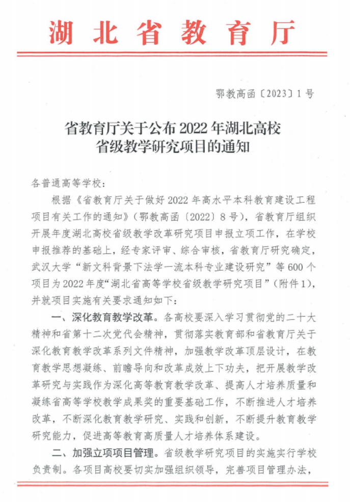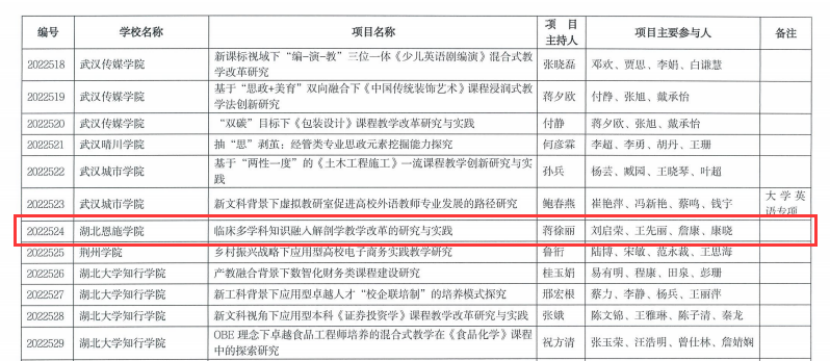 近日,湖北省教育廳發(fā)布了《省教育廳關(guān)于公布2022年湖北高校省級(jí)教學(xué)研究項(xiàng)目的通知》(鄂教高函[2023]1號(hào)),我校蔣徐麗老師主持的《臨床多學(xué)科知識(shí)融入解剖學(xué)教學(xué)改革的研究與實(shí)踐》獲批立項(xiàng)。