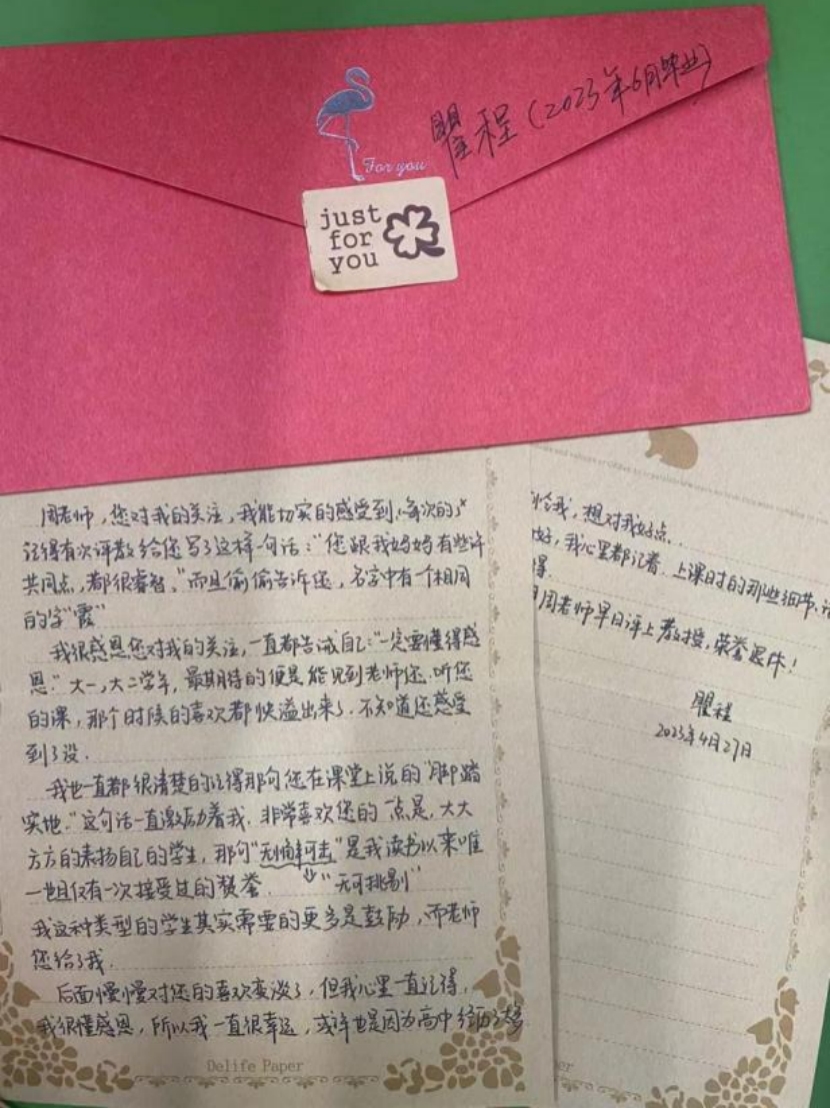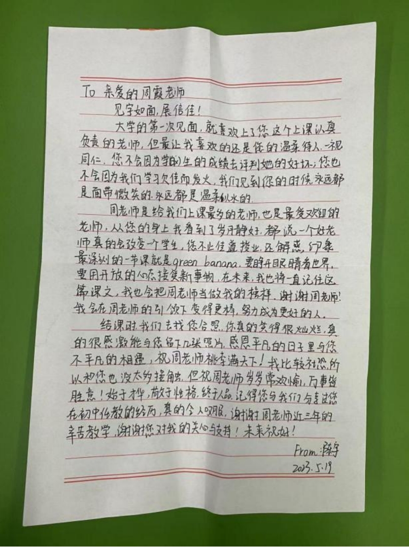 “您不僅傳道授業(yè),還解惑,印象最深刻的一節(jié)課就是《green banana》,您教導(dǎo)我們要睜開眼睛看世界,要用開放的心態(tài)接受新事物,在未來,我也將一直記住這篇課文,我也會把周老師當(dāng)做我的榜樣,謝謝周老師,我會在周老師的引領(lǐng)下變得更棒,努力成為更好的人。”文化與傳媒學(xué)院2019級學(xué)生陳宇給周霞的信中寫道?!拔液芨卸髂鷮ξ业年P(guān)注……大一、大二最期待的就是見到老師您,聽您的課,那時候的喜歡,都快溢出來了……”另一位同學(xué)也通過書信向周霞老師“表白”,他們都是受到周老師鼓勵與支持的學(xué)生,字里行間除了對周老師的感謝,更多的則是周老師對他們?nèi)松挠绊憽?/p>