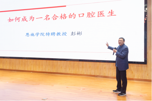 彭彬教授以《如何成長為一名優(yōu)秀的口腔科醫(yī)生》為題,以自身職業(yè)的發(fā)展之路為例,為口腔醫(yī)學(xué)專業(yè)的學(xué)子們的職業(yè)道路做了細(xì)致的介紹,鼓勵(lì)口腔醫(yī)學(xué)學(xué)生勵(lì)精圖治,時(shí)刻以更高的水平要求自己。