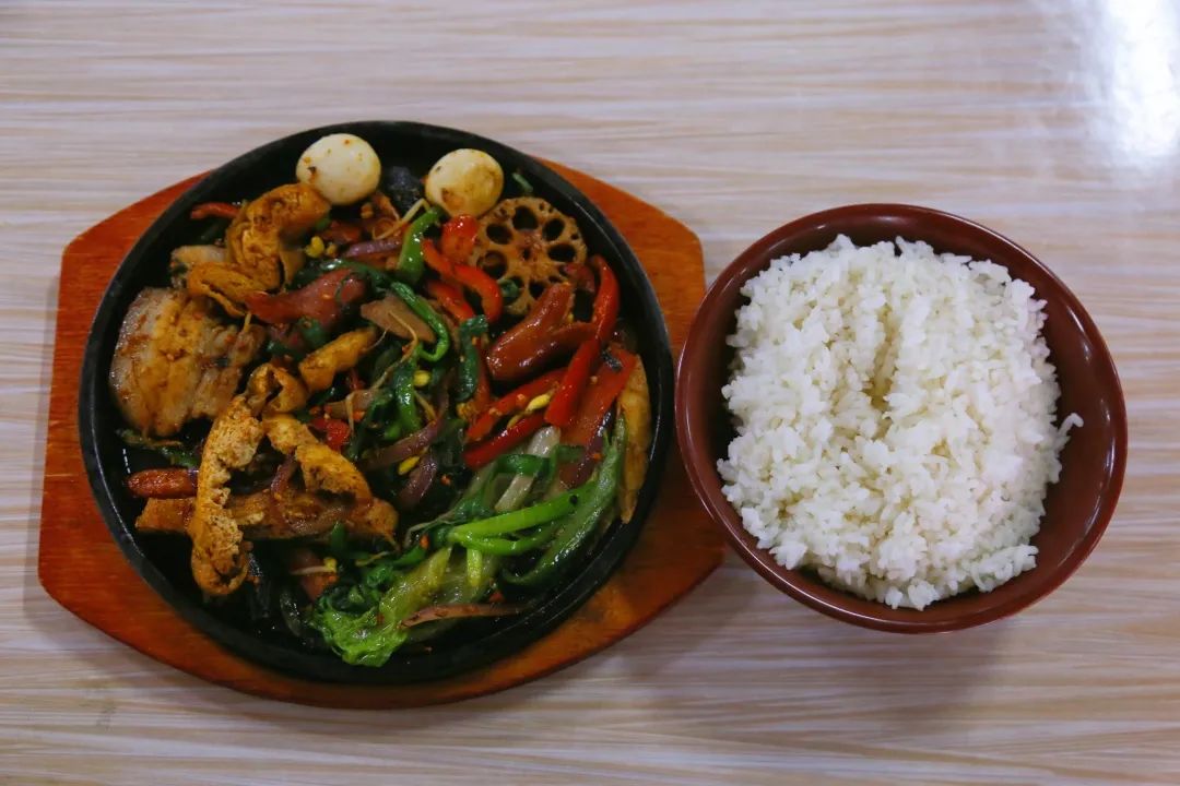 一份烤盤飯就是一份菜、一碗米飯和一碗湯。端上來的時候還滋滋冒油呢,吃第一口就感覺到東北了!