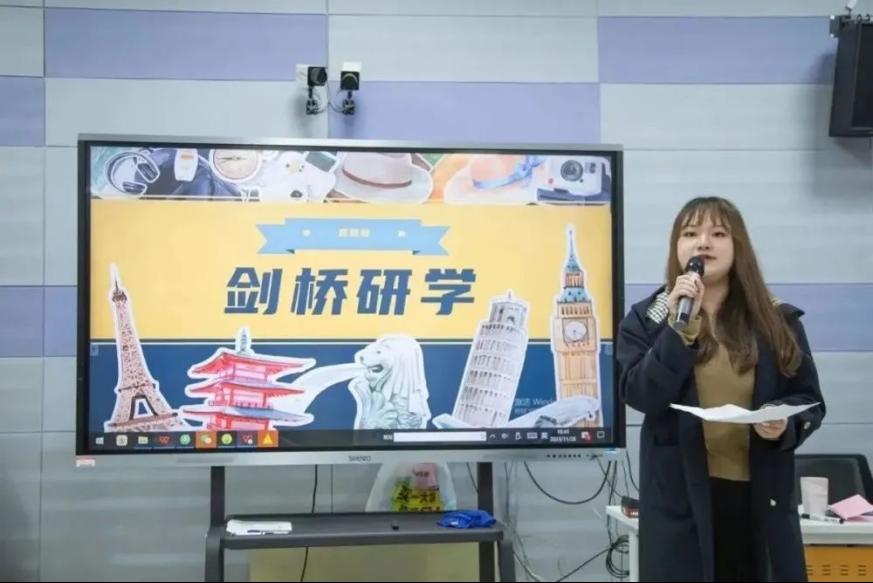 隨后,我校2022學(xué)年暑假參與英國劍橋大學(xué)研學(xué)項(xiàng)目的優(yōu)秀學(xué)生代表唐凱璇為同學(xué)們進(jìn)行了國際研學(xué)分享。她從在劍橋大學(xué)的生活、學(xué)習(xí)、費(fèi)用、個(gè)人感悟四個(gè)方面為大家講述了這一次海外暢游的經(jīng)歷,以親身經(jīng)歷和典型案例詮釋了此次研學(xué)對她帶來的幫助與提升,現(xiàn)場的同學(xué)們對這種新的研學(xué)模式表示出極大的興趣。