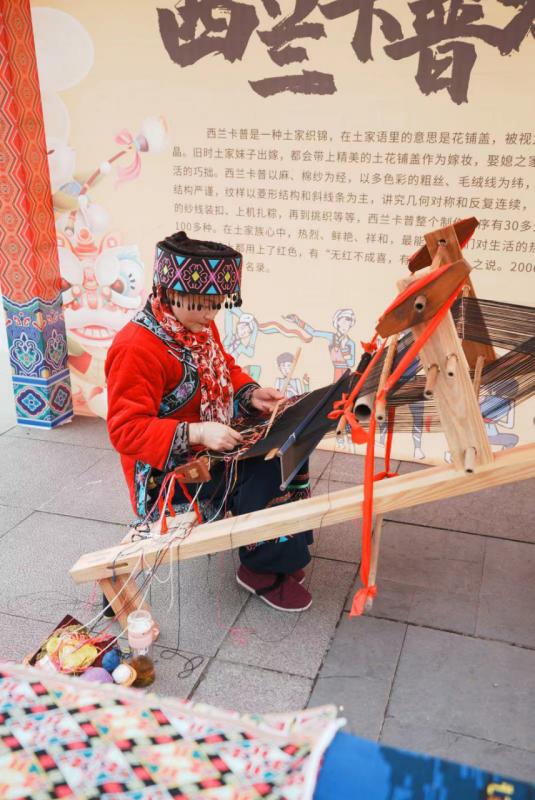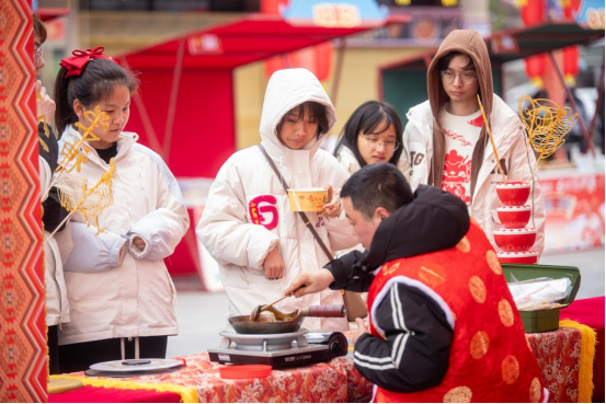 西蘭卡普、儺戲面具等非物質(zhì)文化遺產(chǎn)讓學(xué)生直觀地感受到恩施非遺的魅力,油茶湯、烤糍粑、炕洋芋等恩施名小吃讓外地的學(xué)生回到學(xué)校第一時(shí)間能夠吃到當(dāng)?shù)孛朗?,采蓮船、舞龍舞獅等傳統(tǒng)表演,同學(xué)們感受著民族文化的魅力,開啟了新學(xué)期的“第一課”。此外,學(xué)生還能在現(xiàn)場參與摔碗酒、吹糖人、民族服飾換裝、品茶,體驗(yàn)包餃子、打糍粑等傳統(tǒng)活動(dòng)。