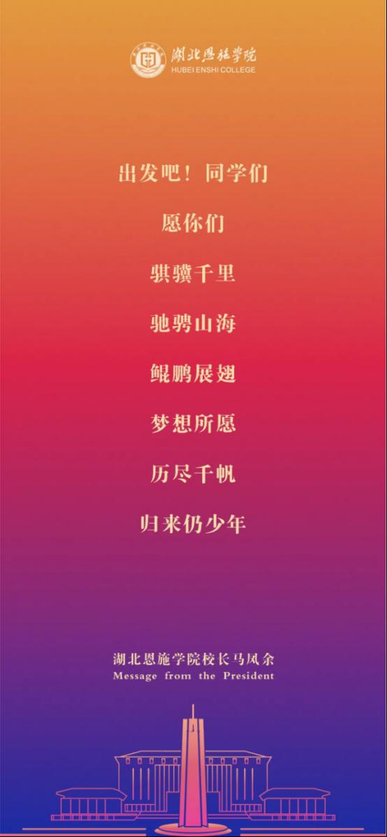 同學(xué)們,當(dāng)施南的古韻敲響日晷的晨鐘,當(dāng)清江的波瀾蕩起琴湖的漣漪,我在“健康中國,使命在肩”的擔(dān)當(dāng)里,在“健康所系,性命相托”的仁心里,看到學(xué)子們用信仰赤誠創(chuàng)造的奇跡,用生命密碼許下的諾言;我在“上德若谷,大道行遠(yuǎn)”的風(fēng)骨里,看到學(xué)子們用筆鋒點墨書寫的春秋;我在“建藝術(shù)大廈,育棟梁之才”的匠心里,看到學(xué)子們用丹青勾畫傳承的佳作;我在“財以富國,經(jīng)世安邦”的宏圖里,看到了學(xué)子們用經(jīng)濟(jì)與法則守護(hù)的盛世;我在“音體齊舞,精彩人生”的韻律里,看到了學(xué)子們用青春音符舞動的史詩;我在“數(shù)字世界,智慧未來”的浪潮里,看到學(xué)子們用智能代碼開辟的新紀(jì)元。