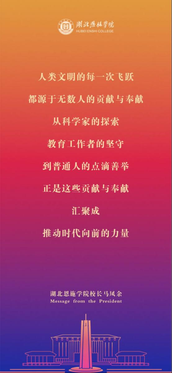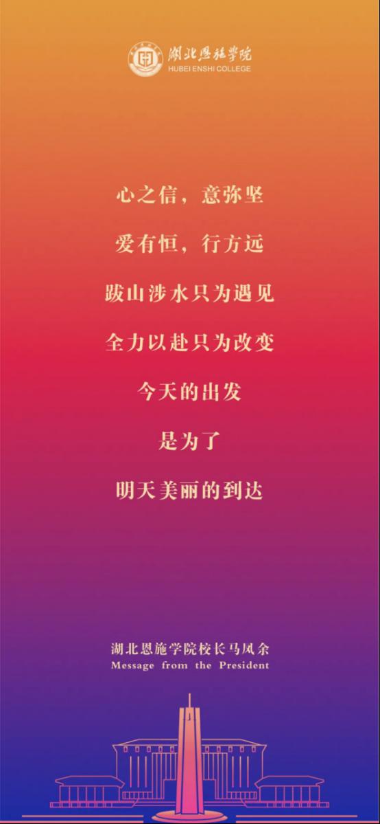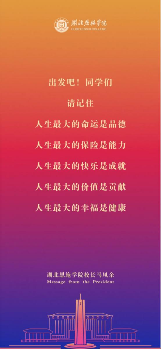 親愛的同學(xué)們,記得入學(xué)時,我與你們共勉恩施學(xué)院學(xué)子要做“四種人”,哪四種人:牢記“正德”之校訓(xùn),做一個品德厚重之人。牢記“至善”之校訓(xùn),做一個悲憫善良之人。牢記“為學(xué)”之校訓(xùn),做一個勤奮好學(xué)之人。牢記“至精”之校訓(xùn),做一個追求卓越之人。“德”是一個人的立功之本。德是海納百川的肚量,是高山仰止的氣度;“善”是一個人最好的修養(yǎng),是世界上最美的成全;“學(xué)”是一個人最好的發(fā)展,是人生最大的競爭資本;“精”是一個人最好的優(yōu)越,是人生最大的價值!八百里清江之波瀾、之不息、之奔騰,琴湖之瀲滟,之清澈、之寧靜。猶如恩施院學(xué)子之勤勞、之純樸、之善良,之自強、之拼搏、之卓越?!扒趧?、純樸、善良,自強、拼搏、卓越”這是恩施學(xué)院學(xué)子應(yīng)有的本色與品質(zhì)!
