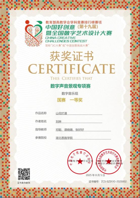 中國好創(chuàng)意暨全國數字藝術設計大賽是我國數字藝術設計領域首個實現“四大突破”的標桿賽事,也是覆蓋數字藝術、數字設計、數字創(chuàng)意、數字媒體和數字技術創(chuàng)新等多個學科門類的綜合性權威賽事,以參賽院校眾多、專業(yè)覆蓋廣泛、社會影響深遠而著稱。在本屆數字聲音景觀賽、數字造夢專項賽等多個賽道中,我校學子憑借獨特創(chuàng)意與精湛技藝勇奪國家級一等獎6項,以卓越成績生動詮釋了我?!耙再惔俳?、教賽相長”的育人理念與實踐成效。