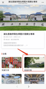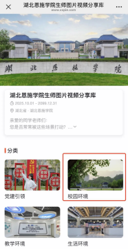 搜索數(shù)智恩施學(xué)院微信公眾號,進(jìn)入頁面,選擇校園應(yīng)用-圖片視頻分享庫,選擇拍攝作品所屬分類,登錄微信后點擊上傳后提交參賽作品。