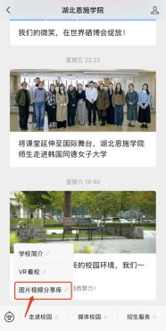 搜索湖北恩施學(xué)院微信公眾號,進(jìn)入頁面,選擇校園生活-圖片視頻分享庫,選擇拍攝作品所屬分類,登錄微信后點擊上傳后提交參賽作品。
