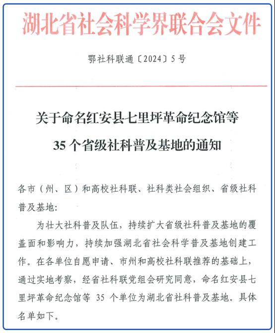近日,湖北省社會科學(xué)界聯(lián)合會下發(fā)《關(guān)于命名紅安縣七里坪革命紀(jì)念館等35個省級社科普及基地的通知》(鄂社科聯(lián)通〔2024〕5號),授予35個單位“湖北社會科學(xué)普及示范基地”稱號,湖北恩施學(xué)院成功獲批,成為本年度同類院校中唯一獲此稱號的高校。