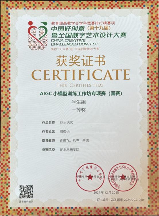 12月20日上午,中國(guó)好創(chuàng)意(第十九屆)暨全國(guó)數(shù)字藝術(shù)設(shè)計(jì)大賽·AIGC小模型訓(xùn)練工作坊專項(xiàng)賽(國(guó)賽)在西安郵電大學(xué)圓滿落幕。經(jīng)過專家現(xiàn)場(chǎng)評(píng)分并頒獎(jiǎng),湖北恩施學(xué)院參賽團(tuán)隊(duì)?wèi){借卓越的創(chuàng)新能力與扎實(shí)的技術(shù)水平,取得了令人矚目的成績(jī)。