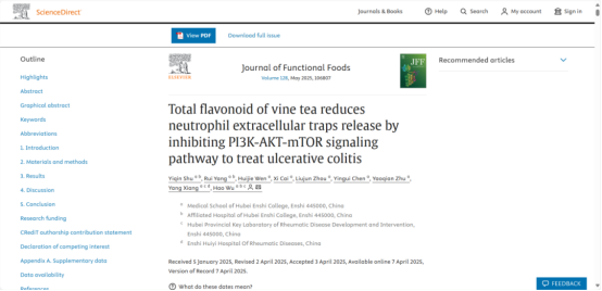 近日,我校醫(yī)學(xué)部基礎(chǔ)醫(yī)學(xué)院副教授吳昊在基礎(chǔ)醫(yī)學(xué)領(lǐng)域取得重要研究進(jìn)展,研究成果Total flavonoid of Vine tea reduces Neutrophil extracellular traps release by inhibiting PI3K-AKT-mTOR signaling pathway to treat Ulcerative Colitis在線發(fā)表在Journal of Functional Foods上。Journal of Functional Foods是由Elsevier出版的權(quán)威國(guó)際期刊,創(chuàng)刊于2009年,ISSN為1756-4646,2023-2024年影響因子為3.8(JCR Q1/Q2分區(qū)),在2025年3月最新中國(guó)科學(xué)院SCI期刊分區(qū)排名為2區(qū)。