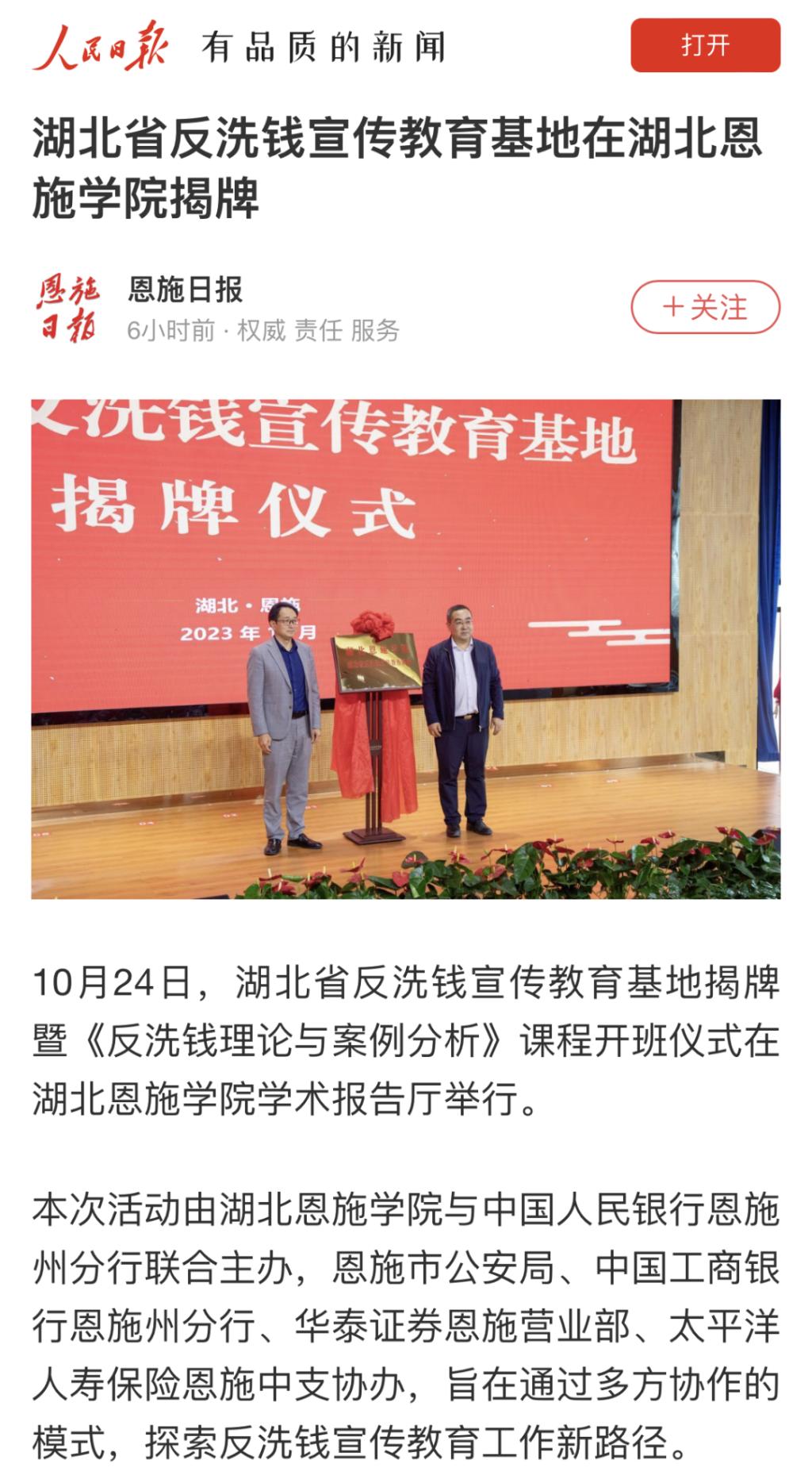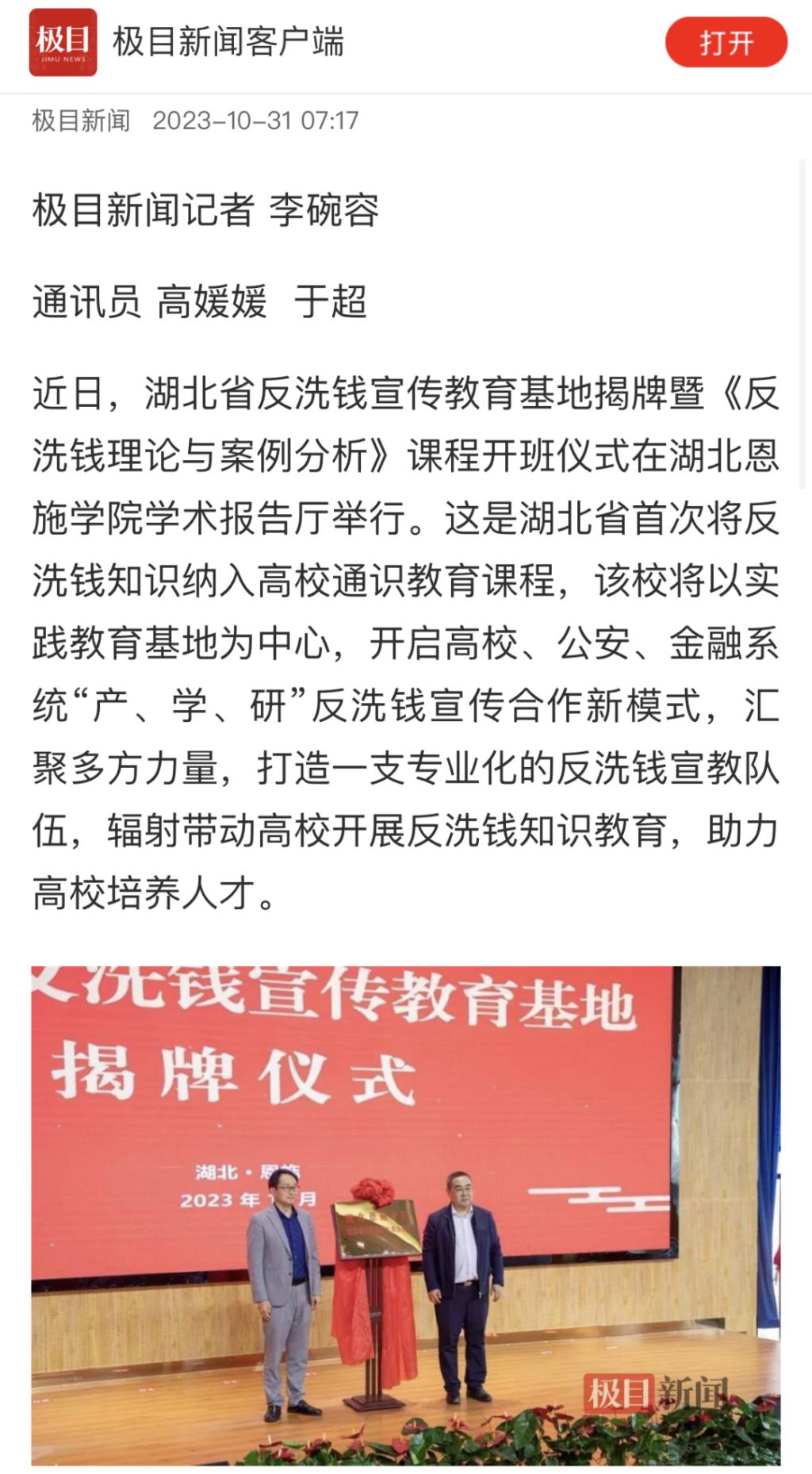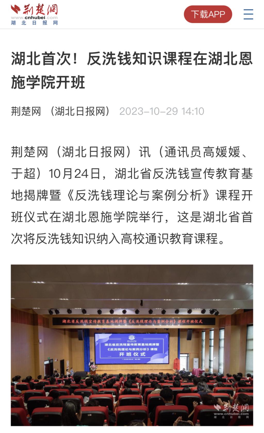 近日,湖北恩施學(xué)院《反洗錢理論與案例分析》這門課程亮相湖北教育頻道。這既是湖北省首次將反洗錢知識(shí)融入通識(shí)課程的創(chuàng)新舉措,也是學(xué)校進(jìn)行通識(shí)課程改革的大膽嘗試。新聞一經(jīng)播出,恩施學(xué)院這門課程獲得各大權(quán)威媒體的廣泛關(guān)注!
