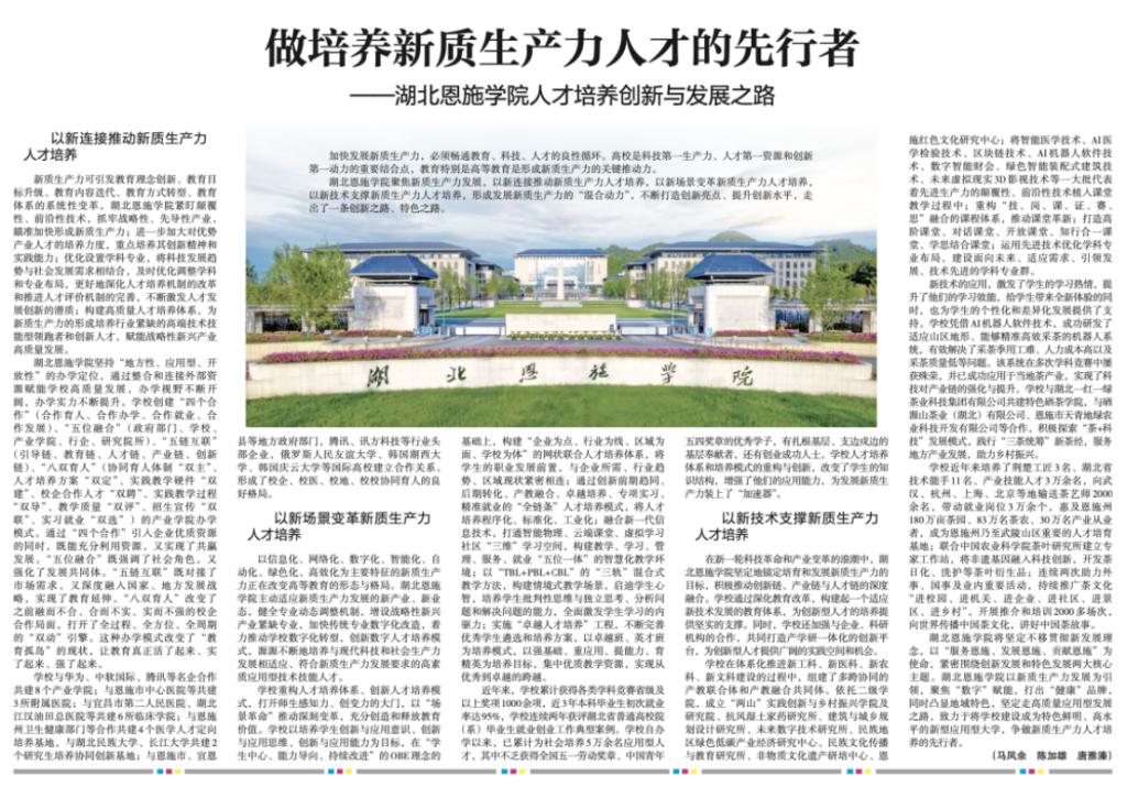 近日,教育核心權(quán)威媒體《中國教育報》第四版全文刊載了湖北恩施學(xué)院題為《做培養(yǎng)新質(zhì)生產(chǎn)力人才的先行者——湖北恩施學(xué)院的人才培養(yǎng)創(chuàng)新與發(fā)展之路》的文章,這是我校辦學(xué)成果第三次登上《中國教育報》,這表明我校推行的人才培養(yǎng)模式及豐碩的辦學(xué)成果受到了教育行業(yè)的廣泛關(guān)注和高度認(rèn)可。