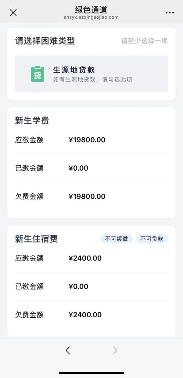 根據(jù)個人情況進行繳費類型選擇;如果無生源地貸款點擊“我要直接繳費”;若有生源地貸款點擊“辦理綠色通道”