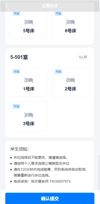 根據(jù)個人喜好選擇對應(yīng)樓棟、樓層、床位;點擊“確認(rèn)提交”
