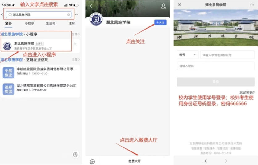 打開手機支付寶軟件,搜索“湖北恩施學(xué)院”,點擊小程序,關(guān)注公眾號,點擊下側(cè)繳費大廳,后續(xù)操作同上(微信)