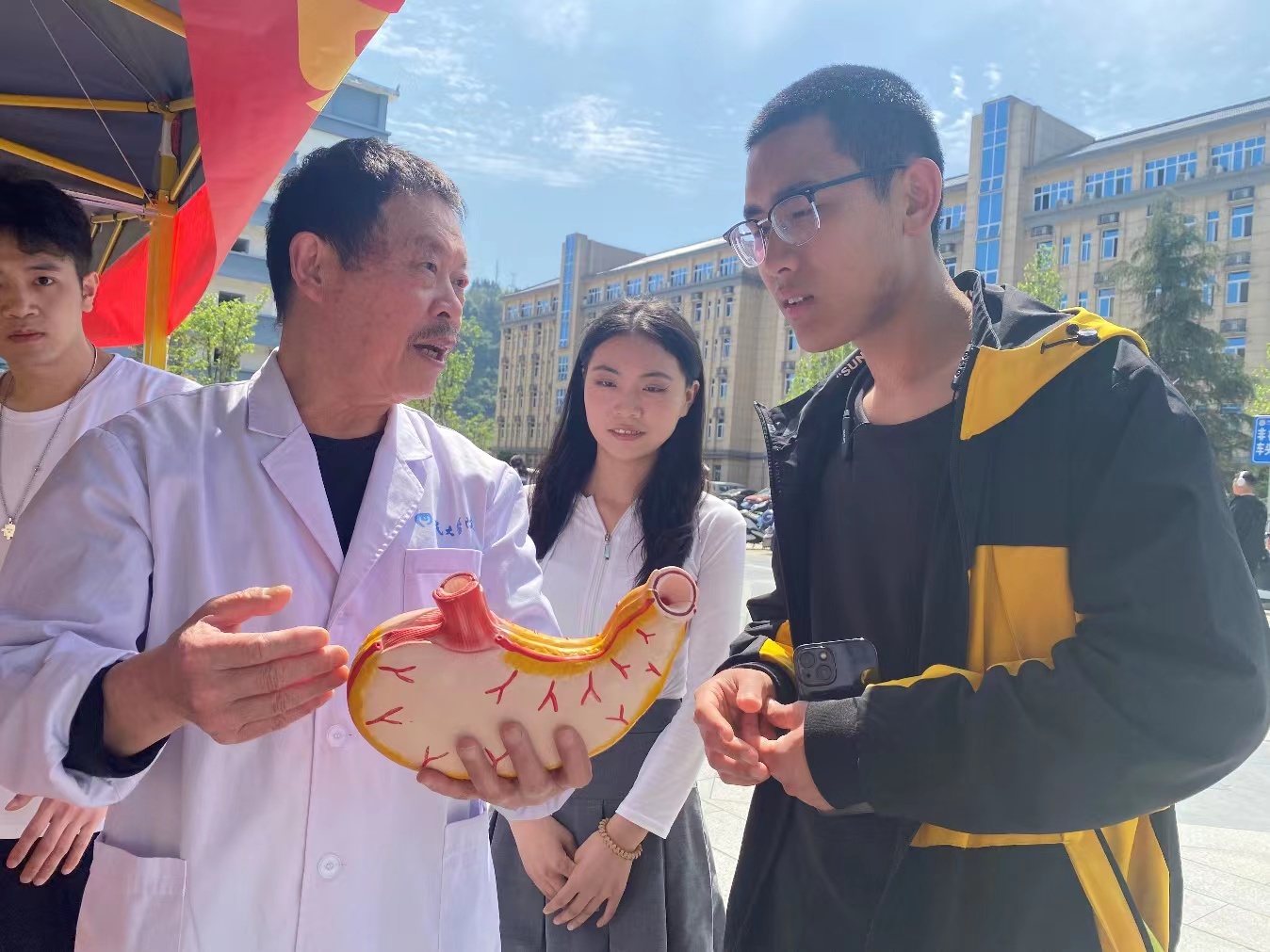 上午12時(shí),活動(dòng)現(xiàn)場已是人來人往。醫(yī)學(xué)院學(xué)生以微視頻、畫報(bào)、展板的形式,對(duì)胃炎、胃潰瘍、胃癌等常見胃部疾病的發(fā)病率、病因進(jìn)行了相關(guān)知識(shí)科普和宣傳教育,目的是向全校同學(xué)進(jìn)行醫(yī)學(xué)科普,引導(dǎo)學(xué)生關(guān)注胃健康。