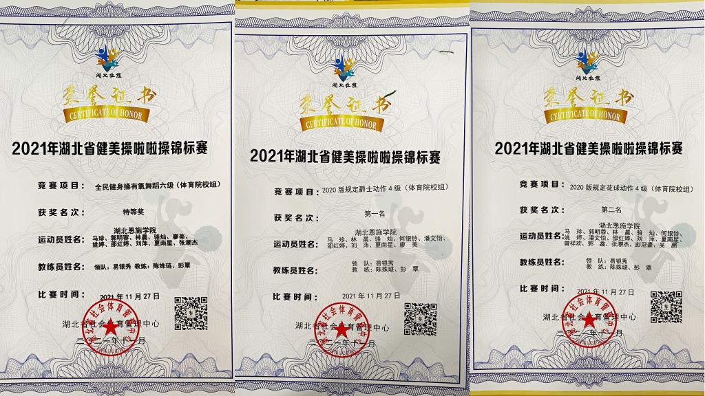 2021年11月27日,“湖北恩施學(xué)院”啦啦操代表隊(duì)在院長(zhǎng)易銀秀、教練陳姝琎和彭覃老師的帶領(lǐng)下,榮獲“全民健身操有氧舞蹈六級(jí)(體育院校組)”特等獎(jiǎng)、“2020版規(guī)定爵士動(dòng)作4級(jí)(體育院校組)第一名、”2020版規(guī)定花球動(dòng)作4級(jí)(體育院校組)第二名的好成績(jī)。