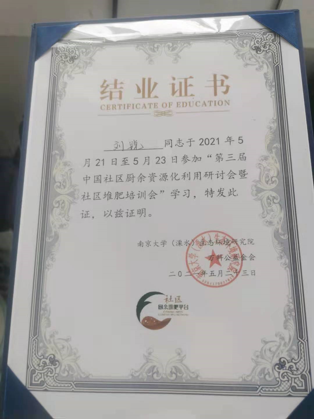中國社區(qū)廚余堆肥試點機(jī)構(gòu)授牌儀式(左三 劉銳同學(xué))