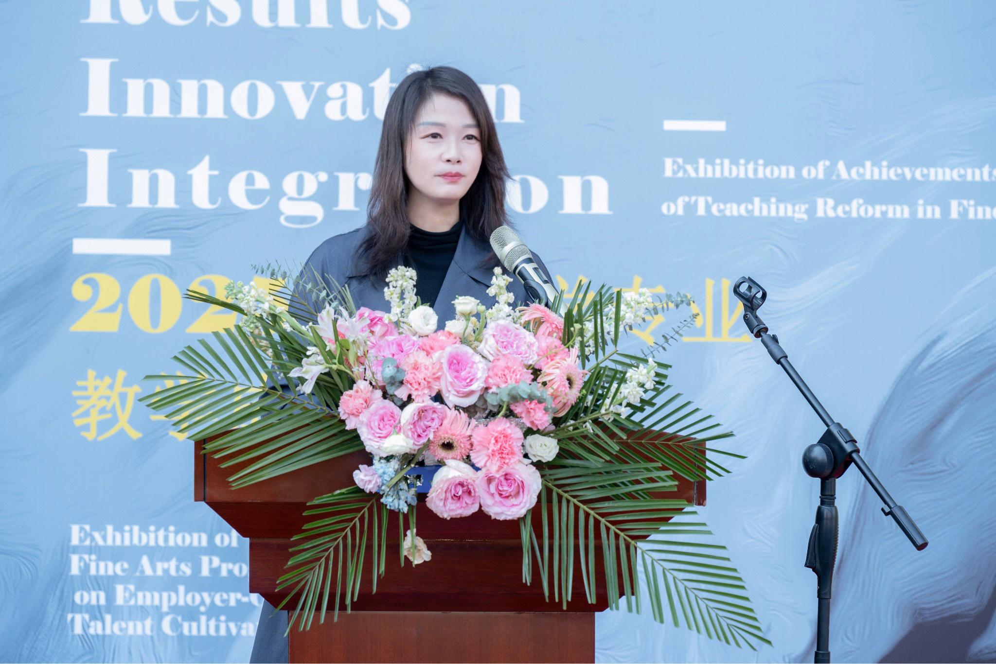 學(xué)生代表張昕燁以樸實(shí)而真摯的語(yǔ)言講述了自己在美術(shù)學(xué)專業(yè)學(xué)習(xí)過(guò)程中的蛻變。她提到,自己的一幅油畫(huà)作品和一件海報(bào)設(shè)計(jì)作品入選此次展覽,內(nèi)心激動(dòng)且充滿感恩?;仡櫝跞氪髮W(xué)時(shí),學(xué)長(zhǎng)學(xué)姐的素描作品深深觸動(dòng)了她。在老師們悉心指導(dǎo)下,她從靜物寫(xiě)生起步,逐漸過(guò)渡到場(chǎng)景創(chuàng)作,逐步領(lǐng)會(huì)“夯實(shí)基礎(chǔ)”的重要性。老師們秉持理性與感性并重的教學(xué)理念,幫助學(xué)生在傳統(tǒng)技法中筑牢根基,在創(chuàng)新實(shí)驗(yàn)中實(shí)現(xiàn)突破。這次展覽不僅是作品的展示,更是大家成長(zhǎng)的見(jiàn)證,記錄了從臨摹到創(chuàng)作,從個(gè)人表達(dá)到關(guān)注社會(huì)責(zé)任的轉(zhuǎn)變。