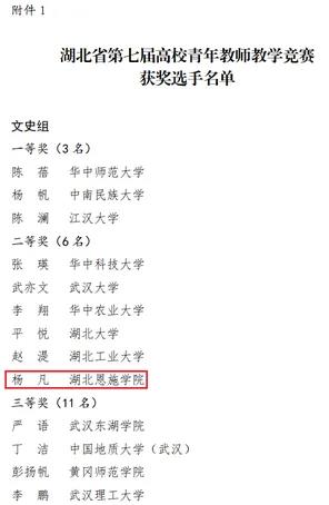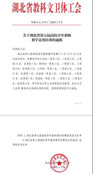 日前,從湖北省教科文衛(wèi)體工會下發(fā)的《關(guān)于湖北省第七屆高校青年教師教學(xué)競賽結(jié)果的通報》(鄂教科文衛(wèi)體工〔2021〕3號)中獲悉,學(xué)校參賽教師楊凡榮獲文史組教學(xué)競賽二等獎,首創(chuàng)佳績!湖北省第七屆高校青年教師教學(xué)競賽由湖北省教科文衛(wèi)體工會主辦,于2021年5月13日-16日在華中農(nóng)業(yè)大學(xué)舉行。湖北省高校青年教師教學(xué)競賽是集中展現(xiàn)我省青年教師教學(xué)水平和教學(xué)能力的最高賽事之一。本次比賽以“上好一門課”為競賽理念,參賽內(nèi)容由教學(xué)設(shè)計、課堂教學(xué)和教學(xué)反思三部分組成,比賽共分為思政組、文史組、理科組、工科組、外語組(英語)五個組別。