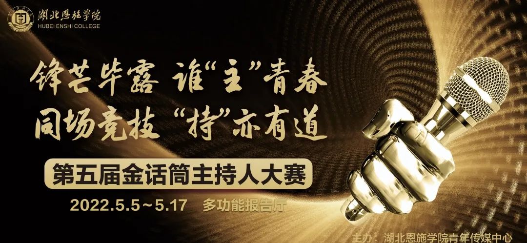 為了營(yíng)造良好的校園文化氛圍,展現(xiàn)新時(shí)代新青年的風(fēng)采,讓同學(xué)們的大學(xué)校園生活更加豐富多彩,也為愛(ài)好主持、想展現(xiàn)自我的同學(xué)們提供一個(gè)舞臺(tái)。同時(shí)也為了配合我校各項(xiàng)活動(dòng)的開(kāi)展,弘揚(yáng)恩施學(xué)院校園文化,豐富校園生活,現(xiàn)面向全校學(xué)生,舉行第五屆“金話筒”主持人大賽。