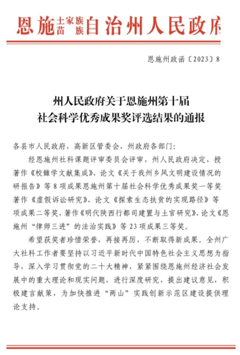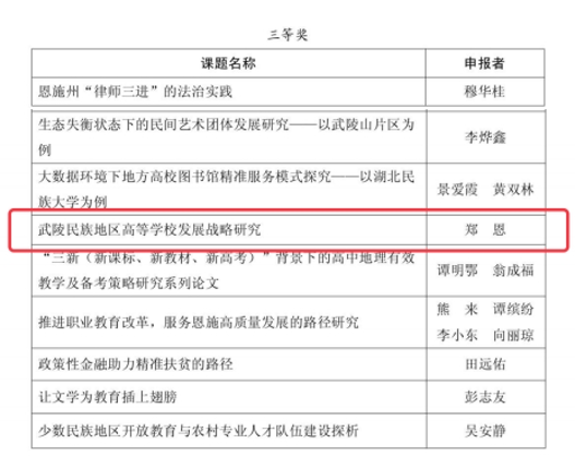 近日,恩施州第十屆社會科學(xué)優(yōu)秀成果獎評選結(jié)果公布,湖北恩施學(xué)院馬克思主義學(xué)院鄭恩老師的《武陵民族地區(qū)高等學(xué)校發(fā)展戰(zhàn)略研究》獲論文類成果三等獎。