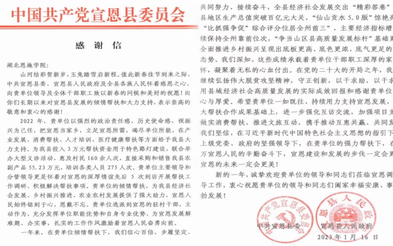 “山河結(jié)彩賀新歲,玉兔踏雪啟新程。”在新春佳節(jié)到來之際,湖北恩施學院駐村工作隊收到了來自宣恩縣委、縣政府的一封感謝信,表揚我校在駐村幫扶工作中取得的成績。