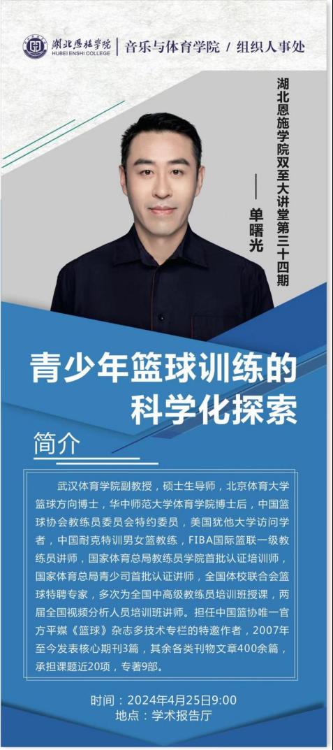 為進(jìn)一步提高我院體育教育專業(yè)教學(xué)水平及體育素養(yǎng),促進(jìn)我院體育專業(yè)教師、學(xué)生教學(xué)及專業(yè)能力進(jìn)一步提升。音樂與體育學(xué)院特邀武漢體育學(xué)院?jiǎn)问锕饨淌?,?024年4月25日在湖北恩施學(xué)院圖書館學(xué)術(shù)報(bào)告廳舉行雙至大講堂第三十四期《青少年籃球訓(xùn)練的科學(xué)化探索》專題講座,學(xué)院體育系教師、學(xué)生積極參與。