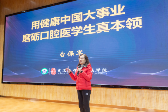 臺(tái)保軍教授為在場嘉賓講授《用健康中國大事業(yè)磨礪口腔醫(yī)學(xué)生真本領(lǐng)》??谇会t(yī)學(xué)的定義、發(fā)展、現(xiàn)狀以及中國居民口腔健康現(xiàn)狀做詳細(xì)介紹,并對我校口腔醫(yī)學(xué)學(xué)子給出明確的建議,希望我校學(xué)子不忘初心,方得始終!