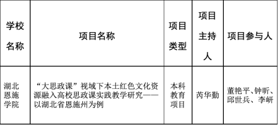 近日,湖北省教育廳公布了2023年湖北本科高校省級教學(xué)改革研究項目立項名單,我校馬克思主義學(xué)院芮華勤老師主持的項目《“大思政課”視域下本土紅色文化資源融入高校思政課實踐教學(xué)研究——以湖北省恩施州為例》獲批立項。