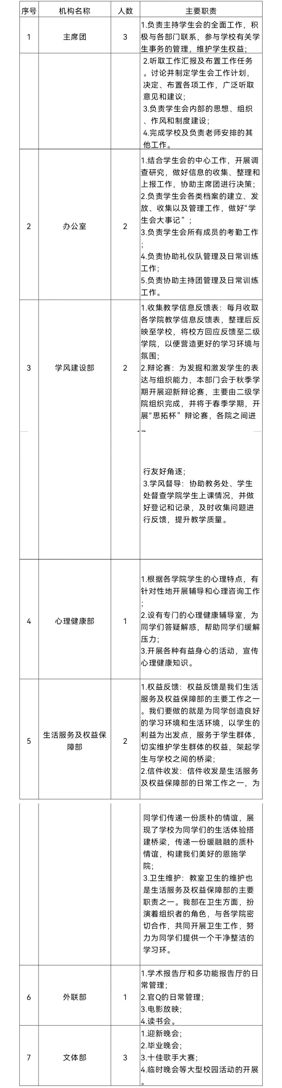 第十七條 校學生會工作人員不超過40人,設主席團4人;工作部門6個(辦公室、學風建設部、心理健康部、生活服務及權益保障部、文體部、外聯(lián)部)各工作部門設部長一人,部門成員總數(shù)不超過六人,校團委組織頒發(fā)任職證書。