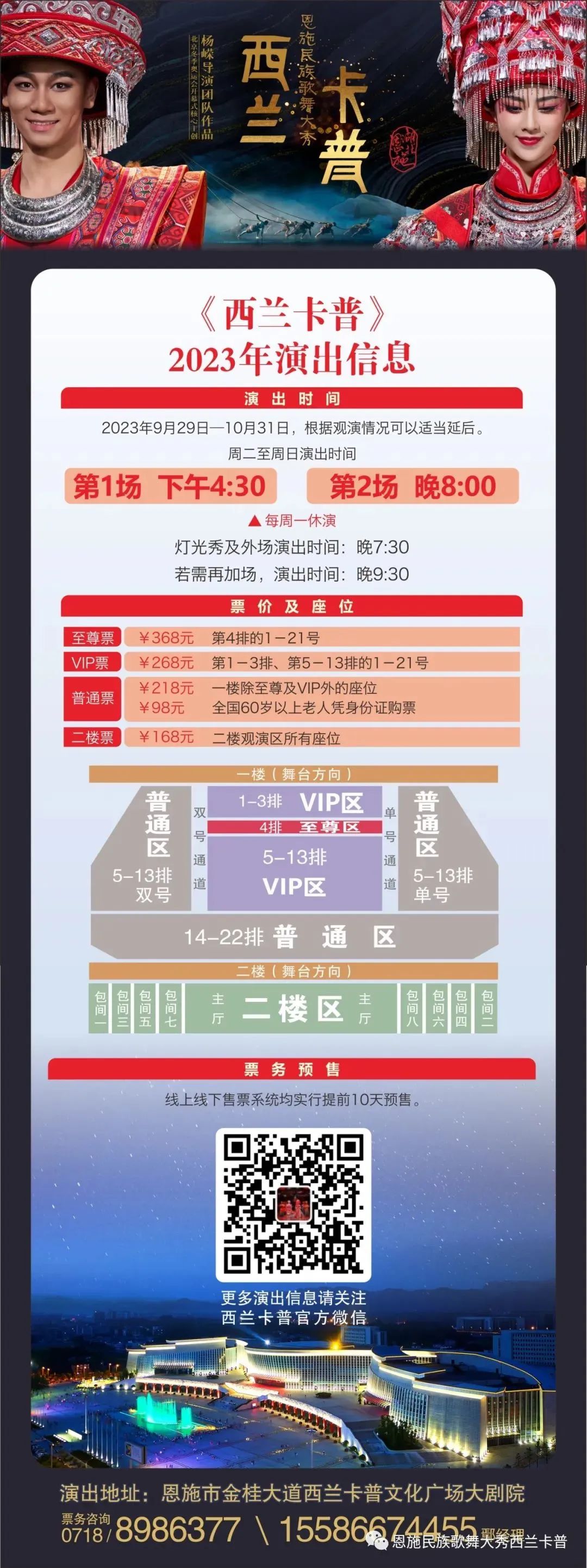 《西蘭卡普》除每周一休演外,其余每天演出時間為下午16:30和晚上20:00,演出地點在具有恩施地標(biāo)形象之稱的恩施西蘭卡普文化廣場,可同時容納1200名觀眾的西蘭卡普大劇院,夜間演出之前您還可以在廣場上欣賞“西蘭卡普燈光秀”,與各族群眾一起跳起歡快的擺手舞,在盡情狂歡中領(lǐng)略中華文化多元一體的無窮魅力!