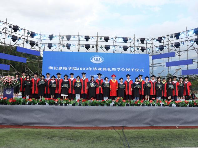最后,由副校長、二級教授、博士萬由祥宣讀湖北恩施學院2022屆學士學位授予決定,由校長馬鳳余以及其它校領導和各二級學院院長們?yōu)楫厴I(yè)生撥正畢業(yè)流蘇、頒發(fā)學位證書、贈送畢業(yè)徽章。