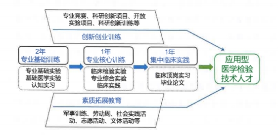 按照“早臨床、多臨床、反復(fù)臨床”的要求加強(qiáng)高校和醫(yī)院合作,充分利用各類實(shí)習(xí)實(shí)訓(xùn)基地,構(gòu)建“2+1+1”逐級(jí)遞進(jìn)的特色實(shí)踐教學(xué)體系,探索大健康觀下卓越醫(yī)學(xué)檢驗(yàn)師協(xié)同培養(yǎng)的途徑,逐漸形成“校院合作、強(qiáng)化實(shí)踐、能力遞進(jìn)”的特色實(shí)踐教學(xué)體系。